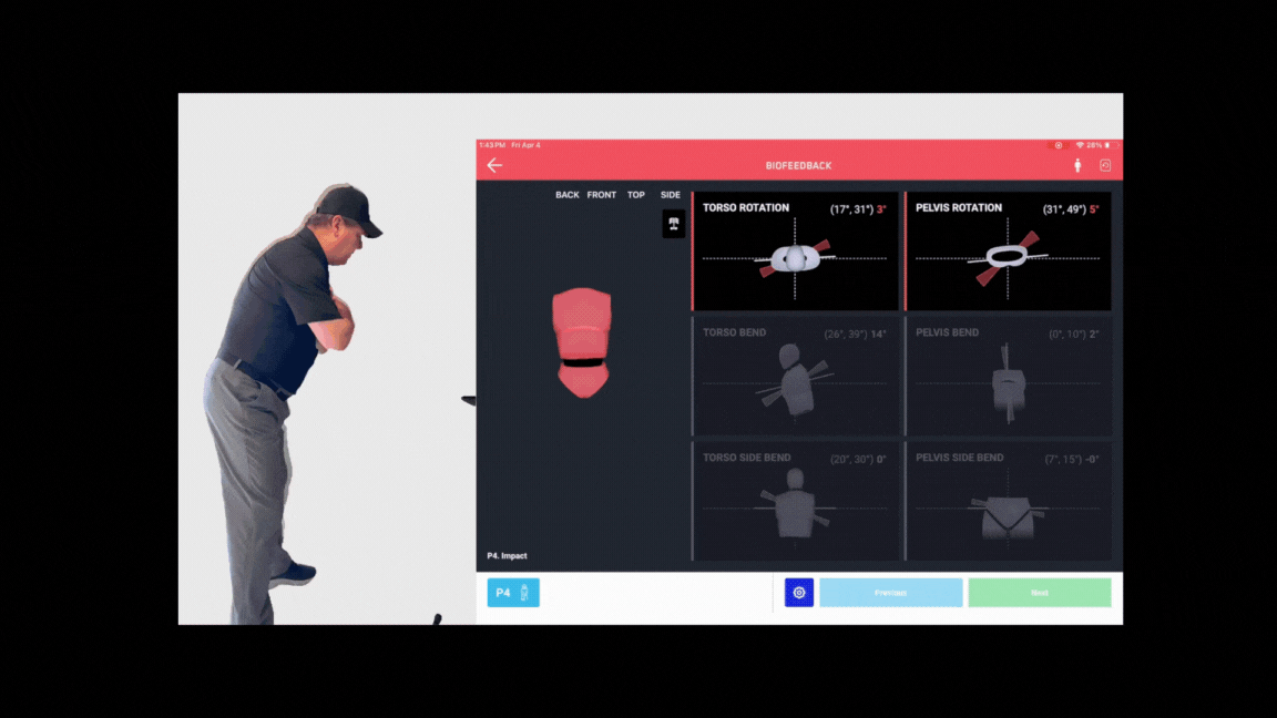 - Position by Position Analysis of your pelvis and torso in 3D from Setup, Halfway Back, Top of Swing, Halfway Down, Impact, Halfway Through, Finish (Ace Package Only)